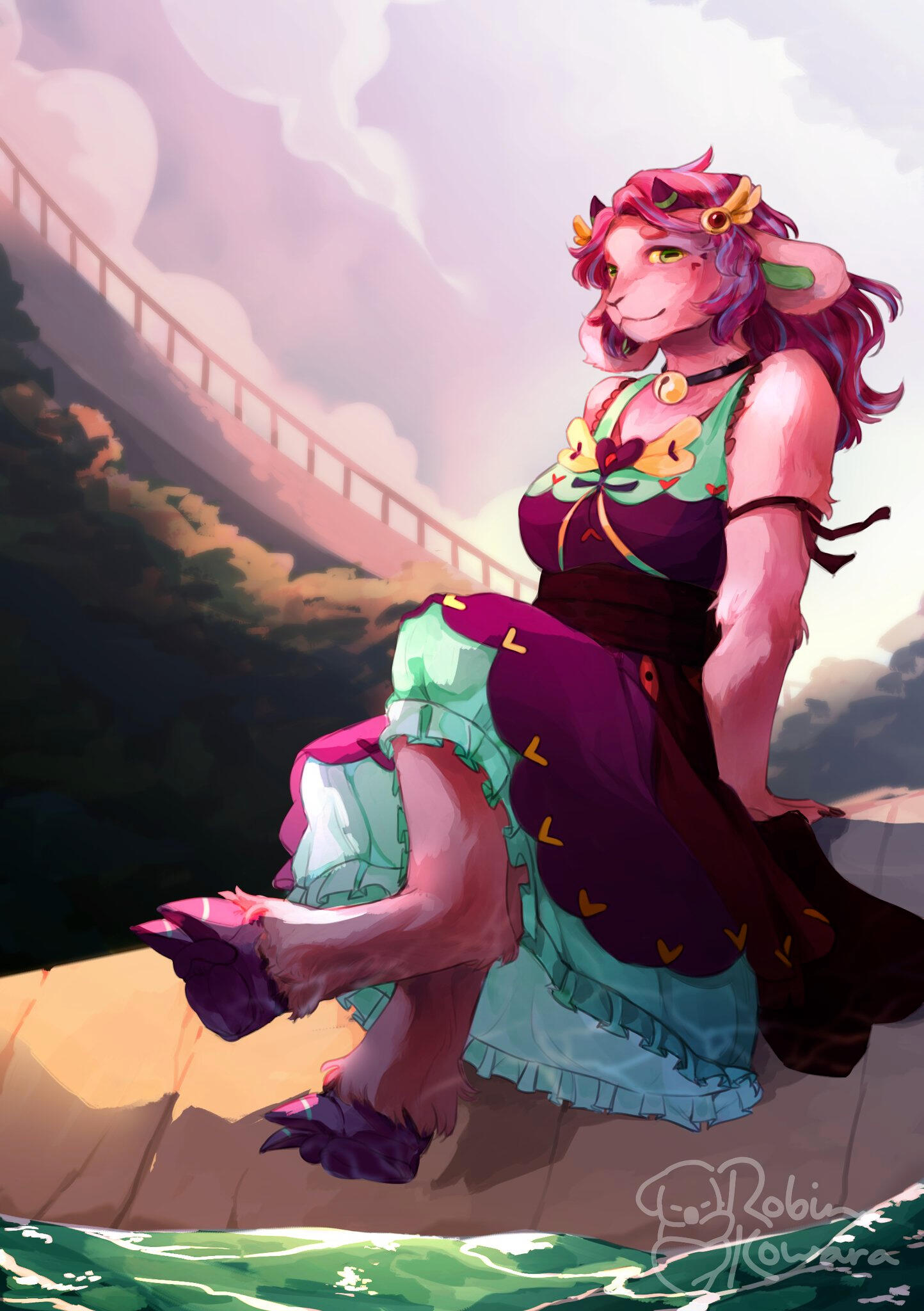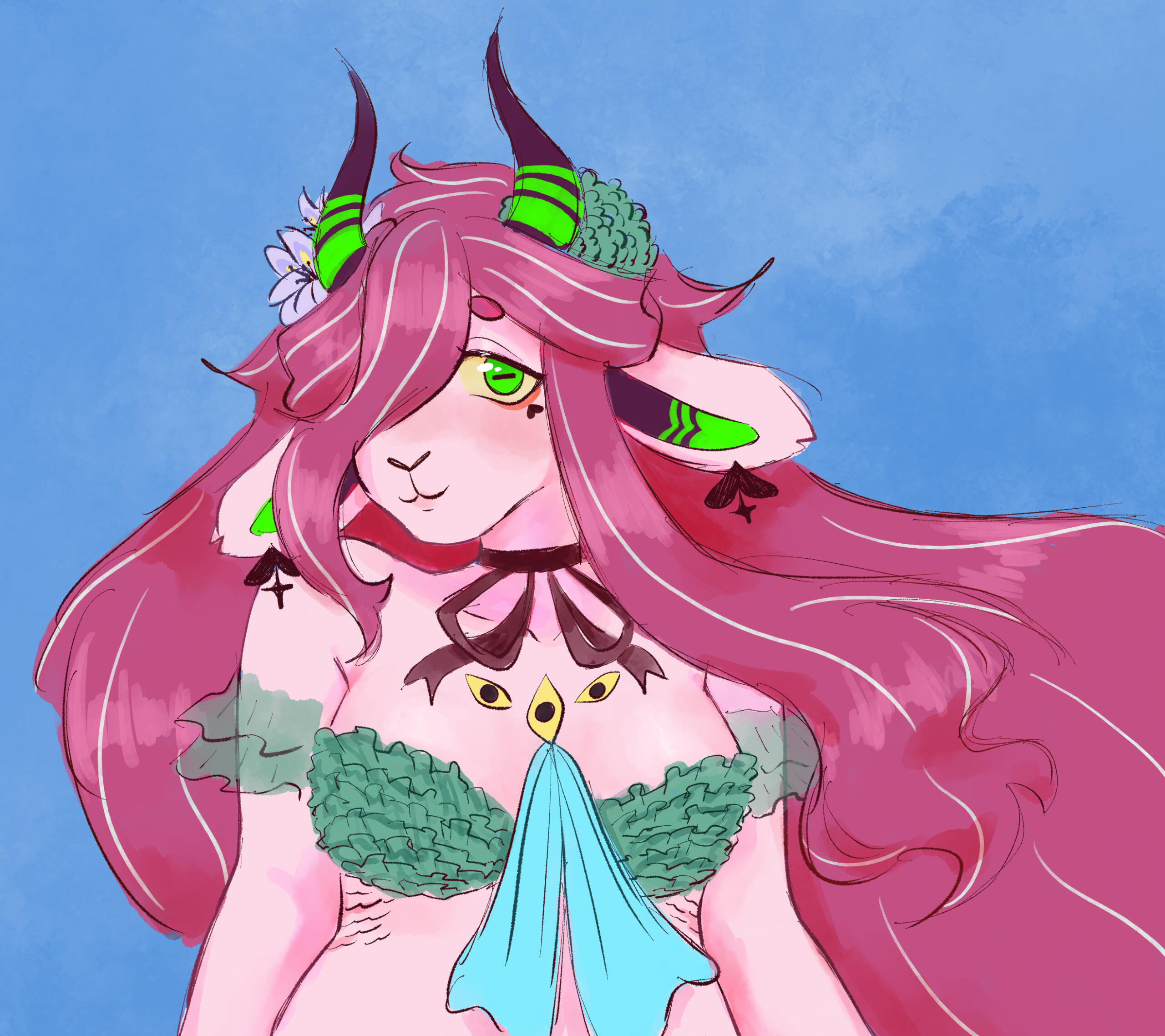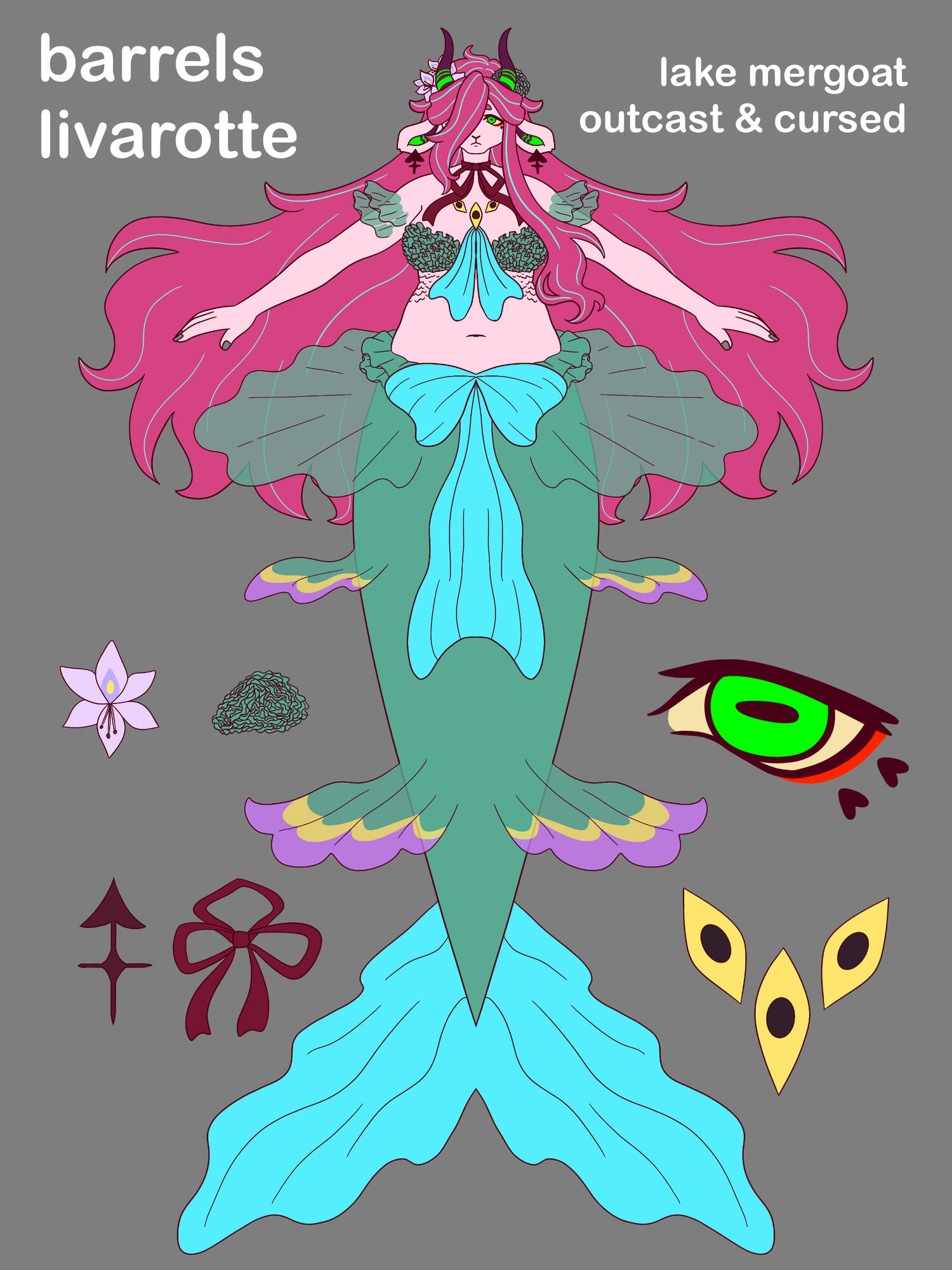 [click here for the lore video]Once upon a time, a mergoat who lived in a lake wished that she could fly like the birds in the sky. She would swim to the shore and attempt to drag herself out. Praying to the sky gods that they would let her fly.Everyday the mergoat would swim to the shore and pray. Her frequent visits slowly led to her scales falling off. After all, this isn't a place for someone like her and her body greatly took the toll.Her scales are fed to the lake's infestation. Soon enough, there were no scales left. The hyacinths grew full. Her tail was gone and was replaced with legs.The lake did not appreciate the ungrateful mergoat who longed for the sky so much.It disowns the ungrateful and wash away their scales. Scales never to be seen again. It was how it serves its justice.On that shore, the mergoat kept praying to the sky everyday but the gods would never grant her wish. Cursed to stay and long for the sky.lol jk no i'm just a furry shut-in vibin in the internet